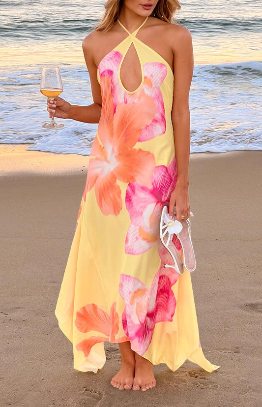 Elowen — Yellow Hibiscus Floral Halter Maxi Dress